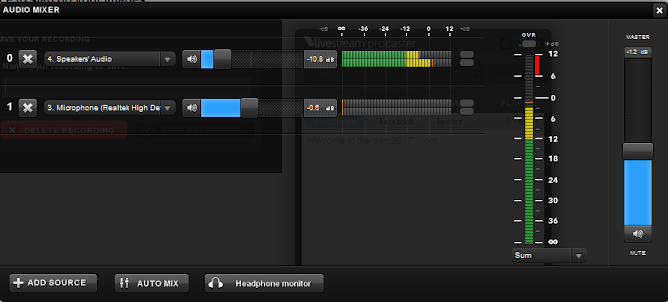 Cette fenêtre volante est accessible soit par l'onglet des préférences audio puis la petite icône “Open audio mixer”, soit par la même icône qui sera positionnée en haut à droite sur le bouton “Stop” pendant une émission.